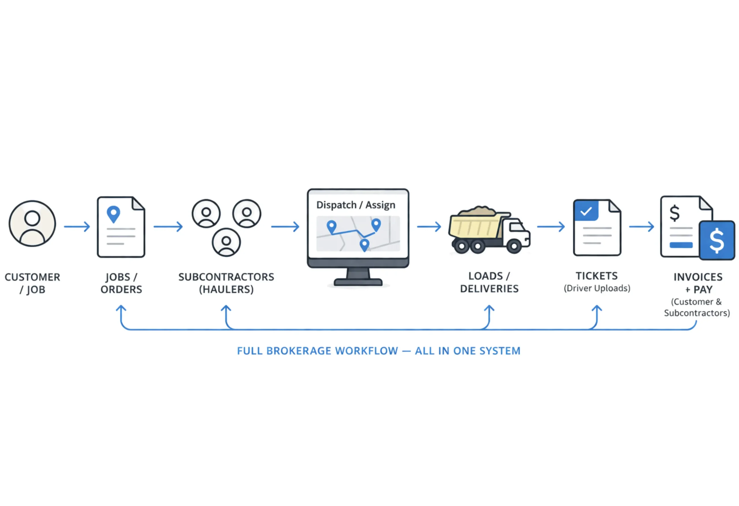 Dump Truck Dispatcher was designed specifically for dump truck and bulk material operations. It accounts for the way brokers quote, dispatch, ticket, invoice, and pay haulers — not the way a long-haul freight company does.